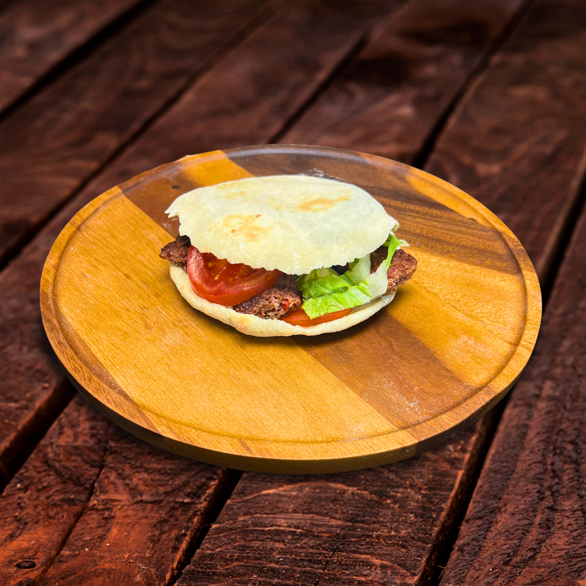 The bread for the burger is freshly made in-restaurant. This Burger is served with Your choice of BBQ meat, along with lettuce, tomatoes, onions, olives, garlic sauce, and hummus.